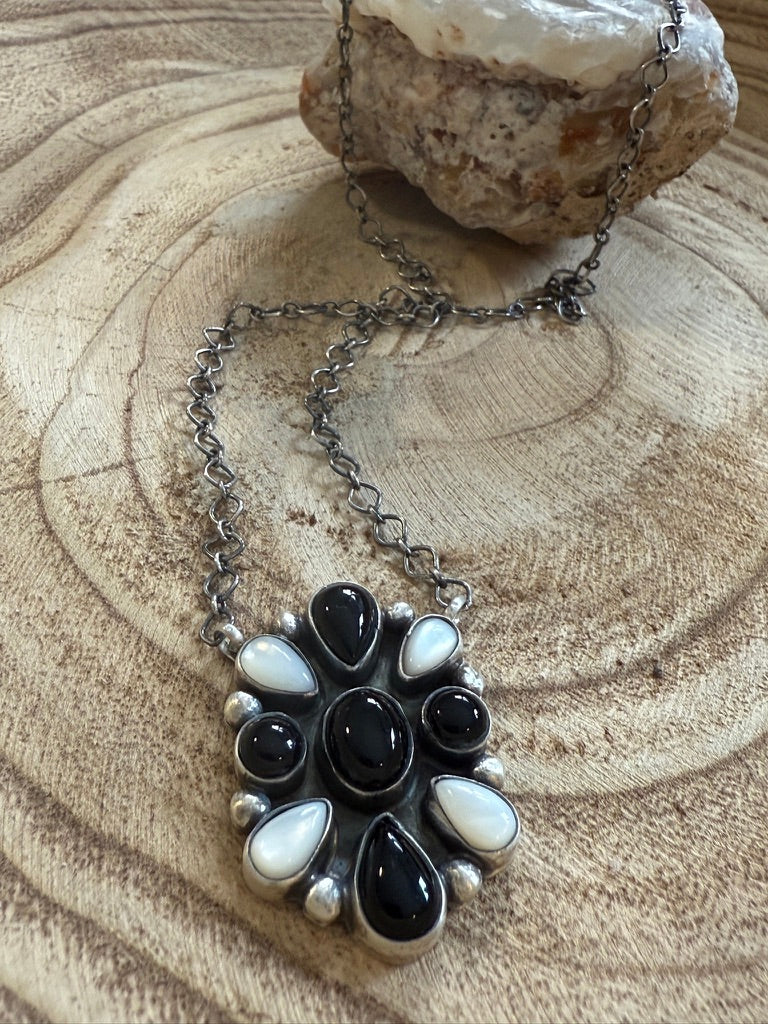 Black Onyx and Pearl Cluster Fixed Pendant Necklace By Sharon Francisco